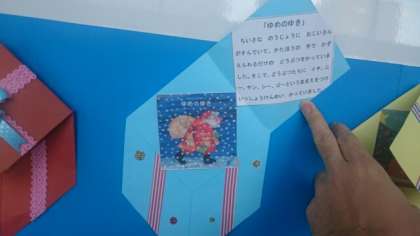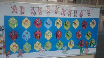 図書室前の掲示物。たくさんのプレゼントが飾られています。めくってみると…、クリスマスにまつわる図書がたくさん紹介されています。いろいろめくって、お気に入りの本を見つけてください。