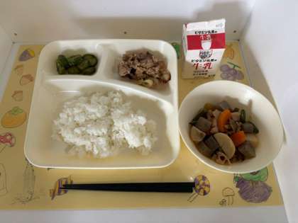 「ふきよせ煮」は、鶏肉、旬のさといもやれんこん、しめじなどを使用した煮ものです。「ふきよせ」とは、数種類の煮ものなどを彩りよく盛り合わせた料理につけられる、日本料理の名前です。