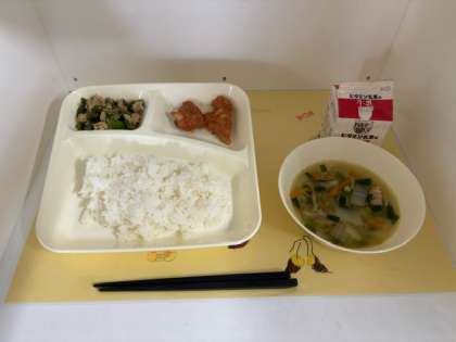 「焼き豚のスープ」は、焼き豚、はくさい、たまねぎ、にんじん、えのきたけ、青みににらを使用しています。