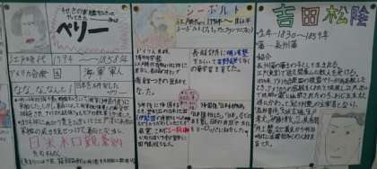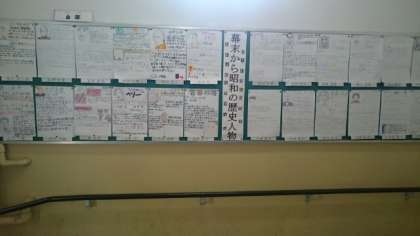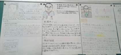 6年生は、歴史新聞を作りました。4月から始めた歴史の学習も昭和の時代まで進みました。今回の新聞は幕末から昭和にかけての歴史人物がテーマです。一人一人ていねいに調べ、読みやすいように工夫しています。似顔絵が何とも言えませんね。懇談会の折はどうぞご覧ください。