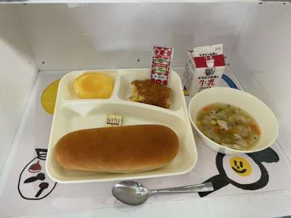 「ツナポテトオムレツ」は、液卵、ツナ、じゃがいもを使用し、塩、こしょうで味つけし、焼き物機で焼きます。ケチャップが1人1袋つきます。