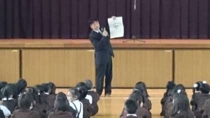 次に3年生から、2学期がんばったこと、3学期がんばりたいことについての作文が発表されました。聞き取りやすい声で、落ち着いて発表することができました。そして、生活指導に関して、交通安全・健全な生活を心がける(お金や物のあげあい、貸し借りはしない等)ことについてのお話がありました。最後にきれいに響く歌声で校歌を歌いました。
