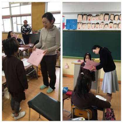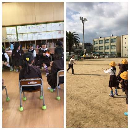 今日は通知表を受け取った後、教室や運動場でお楽しみ会をしました。