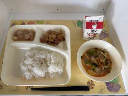 「みそ汁」は、うすあげ、はくさい、にんじん、しめじ、青みに青ねぎを使っています。