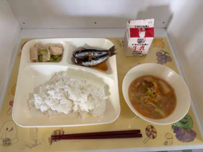 「いわしのしょうが煮」は、1人2尾のいわしを切りこんぶ、調味液とともにミニバットに入れ、さらに、せん切りのしょうがを加え、焼き物機で煮ます。