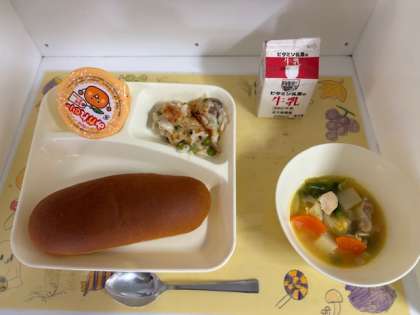 「鶏肉と野菜のスープ煮」は、鶏肉、じゃがいも、キャベツ、にんじん、さんどまめ、コーンを使用しています。