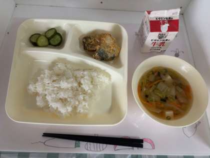 「さばのカレーたつたあげ」は、1人2切のさばにしょうが汁、料理酒、こいくちしょうゆ、カレー粉で下味をつけ、でん粉をまぶし、油であげます。