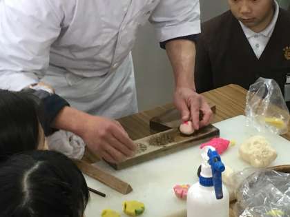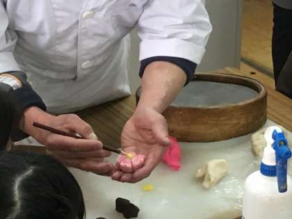 水曜の2時限目に、平尾商店街から和菓子屋さんの「五色屋」さんに授業をしていただきました。季節や行事に関わる和菓子のことを教えてもらったり、実際に和菓子を作っているところを見せていただきました。