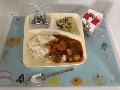 「ハヤシライス」は、牛肉を主材に、じゃがいも、たまねぎ、にんじんなどを使い、水どき上新粉でとろみをつけ、調味料で味つけして煮こみます。