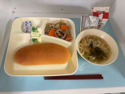 「なにわうどん」は、1/16の三角に切ったうすあげを焼き物機で煮ます。かまぼこ、はくさいと青みに青ねぎを加え、だしの旨みを味わうことのできるシンプルなうどんに仕上げています。教室で配缶後、とろろこんぶを1人1袋入れていただきます。