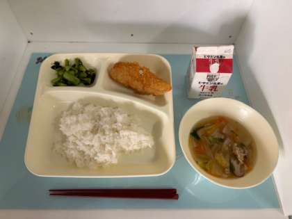 「うすくず汁」は、鶏肉、はくさい、だいこん、にんじん、しいたけ(生)、青みにみつばを使用しています。水ときでん粉でとろみをつけ、冷めにくくしています。