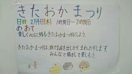 ハッピーグループ活動(たてわり班活動)における最大のイベント「きたおかまつり」が近づいてきました。今年度は、お店もハッピーグループで出します。(これまではきょうだい学年での出店でした)限られた時間の中でお店を開くのは大変かもしれませんが、苦労がある分、異学年交流はよりよいものになるかと思います。ぜひ、リーダー学年を中心に、みんなで協力してもらいたいと思います。当日は幼稚園や保育所のお友だちも参加する予定です。水曜日に準備があります。みなさん、がんばってください!