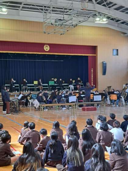 大阪教育大学吹奏楽部のみなさんにお越しいただきました。目の前で繰り広げられる演奏に見入ったり、美しい音色のリズムにのって手拍子を打ったりしながら楽しく鑑賞しました。「ジャンボリー・ミッキー」では、大学生と一緒に踊り、盛り上がりました。吹奏楽部のみなさん、素敵な演奏を聴かせていただきまして、ありがとうございました。