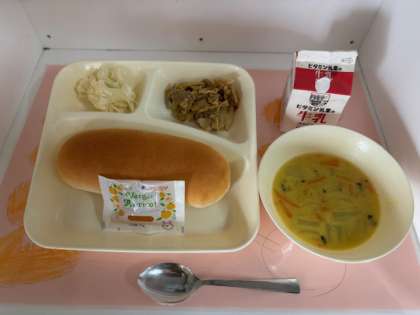 「豚肉のカレー風味焼き」は、豚肉に塩、こしょう、カレー粉、綿実油で下味をつけ、たまねぎを混ぜ合わせ、焼き物機で焼きます。
