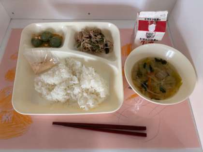 「よもぎだんご」は、焼き物機で蒸したよもぎだんごにみつをからませ、喫食時にきな粉をまぶして食べます。春を感じる献立の一つです。