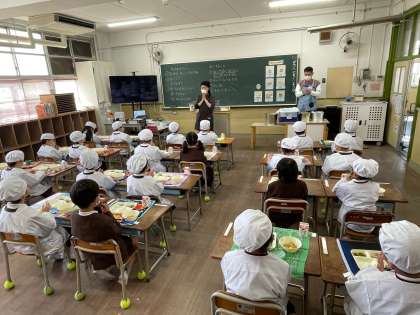 おととい入学した1年生が、はじめての給食を食べました。いきなり「じゃこピーマン」というメニューでしたが、おかわりして食べる子もいました。牛乳パックも上手に開けることができました。みんなニコニコで、楽しく、おいしくいただきました。