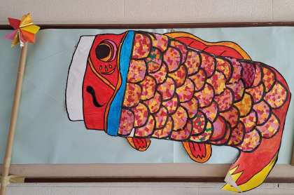 5月の玄関掲示が完成しました。みんなでウロコのデザインを作成し、優雅に鯉のぼりが泳いでいます!