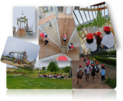 曇り空でしたが暑さをあまり感じずに、思いっきり遊具で遊びました。時間や遊び方の約束を守ることができました。保育園の子どもたちと一緒になり、やさしくシーソーで遊んであげる姿が見られました。新しい学年での初めての校外学習で、昨年からとても成長した子どもたちでした。お弁当の時に小雨が降ってきたので、橋の下でおいしく食べました。お弁当などをご用意いただきまして、ありがとうございました。