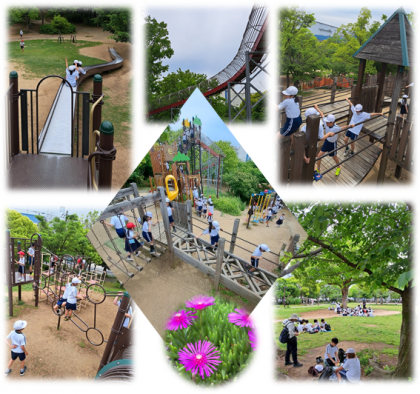 尼崎市にある元浜緑地に出かけました。アスレチックや大型すべり台で思う存分遊びました。遊具での手足の使い方や動きの俊敏さから子どもたちの身体能力の高まりを感じました。シロツメクサで花飾りを作る子もいました。思い思いの時間を楽しく過ごしました。