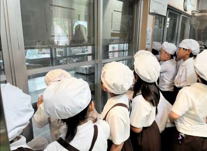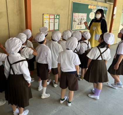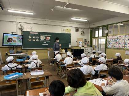 食育の学習をしました!給食の先生(栄養教諭)に、給食は誰がどのように作っているのかを教えてもらいました。中学校の分も含めて、780人分を9人で作っていると聞き、子どもたちはとても驚いていました。最後に、給食を作っているところを見学させてもらいました。大きな釜を大きなヘラでかき混ぜる姿を見るのも、興味津々でした。