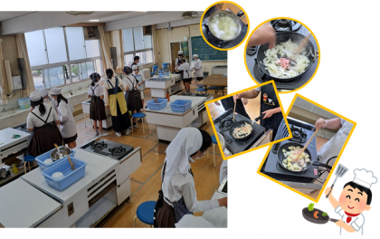 6年生になり初めての調理実習を行いました。「炒める」をテーマにジャーマンポテトを作りました。これまでに学習した「切る」「ゆでる」も活用し、玉ねぎ・じゃがいも・ベーコンを切ったり、じゃがいもを茹でたりするとともに、適切なタイミングで炒めた玉ねぎと合わせました。味付けの塩コショウの分量が難しかったようで、辛くなってしまった班もありました。みんな美味しく食べました!
