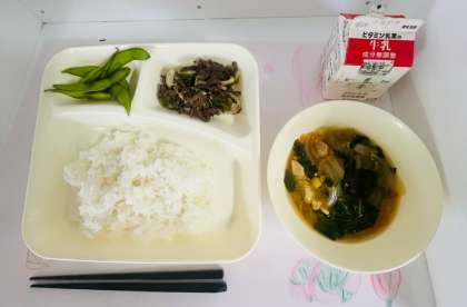 「中華みそスープ」は、鶏肉を主材に、しいたけで旨みを出し、青みにチンゲンサイを使い、彩りよく仕上げています。こしょう、うすくちしょうゆ、赤みそ、中華スープの素で味つけします。