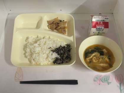 「みそ汁」は、とうふ、うすあげ、キャベツ、こまつな、にんじんを使用しています。