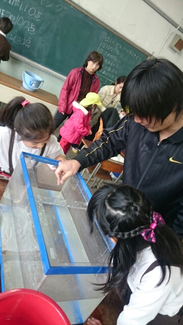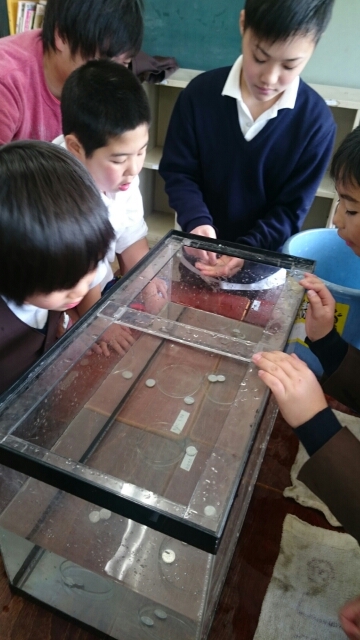 おなじみ、1円玉落としです。どれだけ慎重にねらいをつけても、水の作用で1円玉がゆらゆらゆれて、目標のところまでいきません。動きを予想して、手を放す瞬間が緊張します。