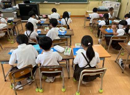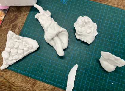 図画工作の時間に、油粘土でとびっきりの「ごちそう」を作りました。ハンバーグにケーキ、ピザなど…。細かいところまでこだわって、丁寧に作ることができました。友だちの作品を鑑賞して、良いところを真似したり、伝えたりすることもできました。