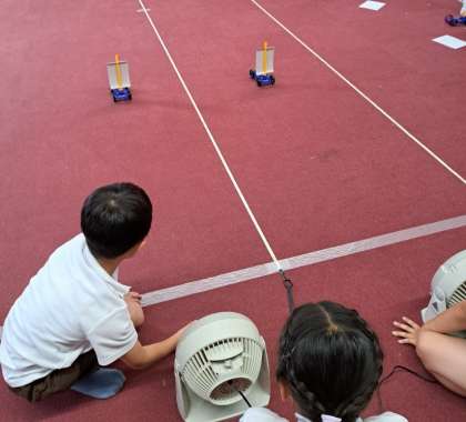 植物のつくりの学習に続き、「風の力」について実験キットを使って学習をしました。風の強さによって車が動く距離をはかり、風の力のはたらきについてきまりを見つけました。また、台風2号が発生しそうなので、過去の大型台風による暴風の様子を動画で見て、風の怖さも知りました。