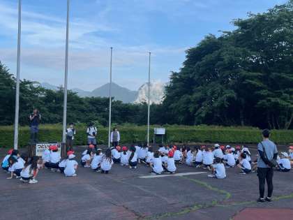 昨日の大雨がうそのように、爽やかに晴れ渡りました。ひんやりと涼しい空気が気持ち良く感じられます。寝不足気味な人もいるようですが、しっかり体操をして、最後の1日がんばります!