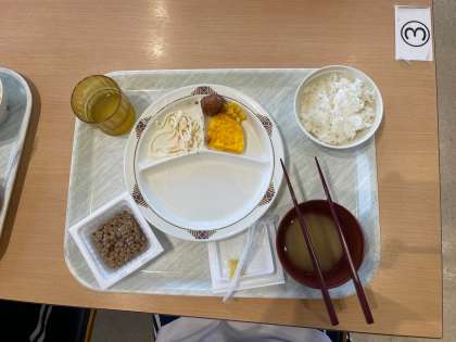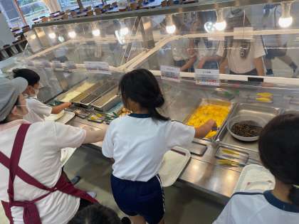 朝のつどいの後、部屋の寝具の整理を行い、バイキングスタイルの朝食です。ご飯派の人もパン派の人も、両方食べる人も、みんな美味しくいただきました。