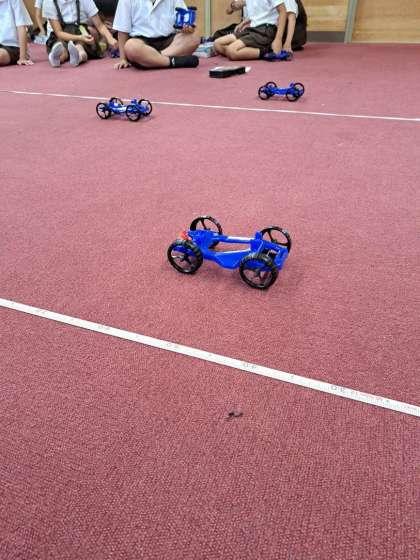 前回の風のはたらきに続き、「ゴムにも物を動かすはたらきがあるのかどうか」をテーマに、実験キットを使って調べました。5cm、10cm、15cmとゴムを伸ばす長さごとに車が動く距離を測りました。5cm、10cmの結果を受けて、15cmではどうなるのか予想をしながら取り組みました。