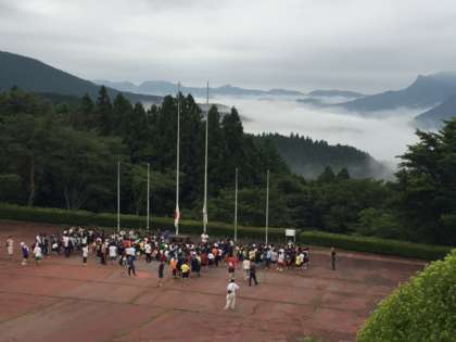 なんとか天気がもってくれることを祈りながら、朝の集いを外で行いました。