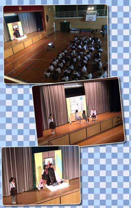 脚本から小道具まで子どもたちの手作りで、「歯磨きの大切さ・噛むことの大切さ」についての発表をしました。