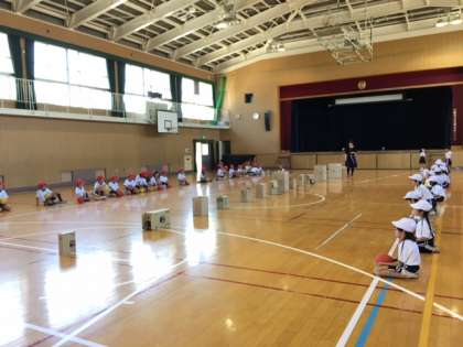 段ボールを狙って投げたり転がしたりして、チームで得点を競います。