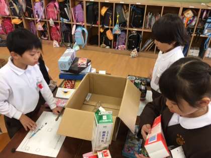 算数の「かたちあそび」の学習では、お家から持ってきた空き箱を使って取り組んでいます。
