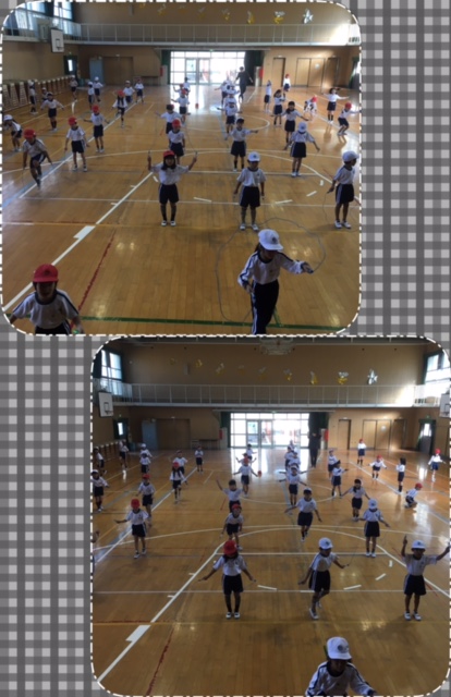 準備運動で縄跳びをしています。授業を始めた頃よりもリズム良く跳べる児童がかなり増えてきました。