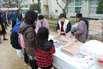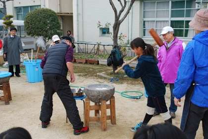 二組の杵と臼を出して、どんどんおもちをついていきます。子どもたちも子ども用の杵を持って、がんばっておもちをつきました。できあがったおもちはすぐに丸められ、あんこもち、きなこもち、大根おろしもちへと調理されました。つきたてのおもちの味は最高で、どんどん食べられました。また、豚汁も振る舞われ、暖をとりながら大変おいしかったです。