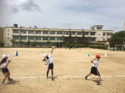 木曜日、5年生はソフトボール投げの練習をしています。防球ネットを使って、角度をつけて投げる練習をしたあとに、ネット無しで練習しました。エアネットにぶつからないように意識しながら投げると遠くまで飛ばすことができました。