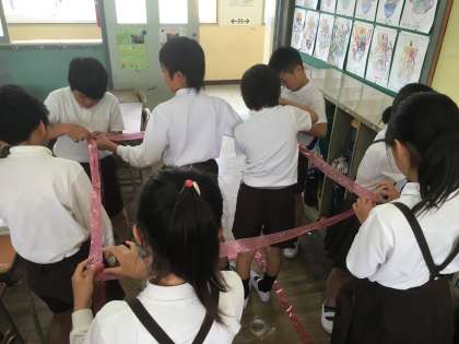 月曜日、算数の授業で「1立方メートル」を学習しました。実際に大きさを確認するためにスズランテープで立方体を作ってみました。協力して作業し、最後には何人入れるかチャレンジしました。