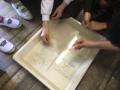 今年度、5年生はお米を作ります。まず始めの仕事は、芽出しです。種もみを水に浸して芽を出させます。きちんと毎日、水の入れ替えをしないといけません。おいしいお米が食べられるように、みんなでお世話していきたいと思います。