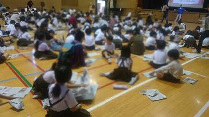 写真は、4〜6年生も、身近なもので防災グッズを作りました。新聞紙で作るスリッパは、三つ織りをするところが難しかったようです。