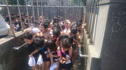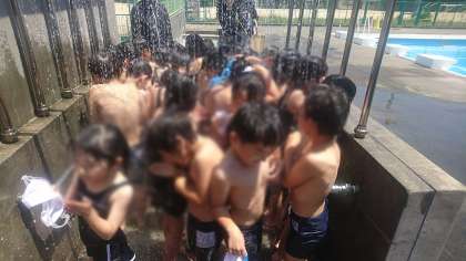暑い1日でしたので、シャワーの水の冷たさは、あまり感じなかったようです。1年生は、勢いよく流れてくる水に驚きながら、シャワーを浴びました。しっかりごしごし体をこすって、水浴びをしてから入水しました。