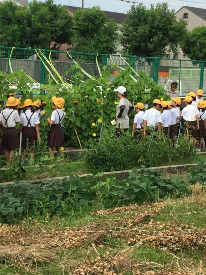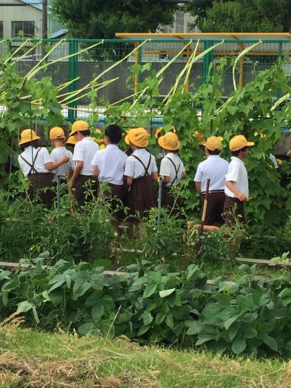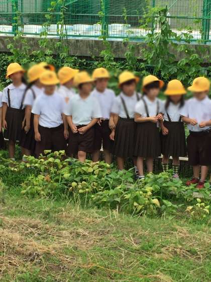 児童朝会後、学習園にいって、理科の学習で植えたヘチマの観察をしました。