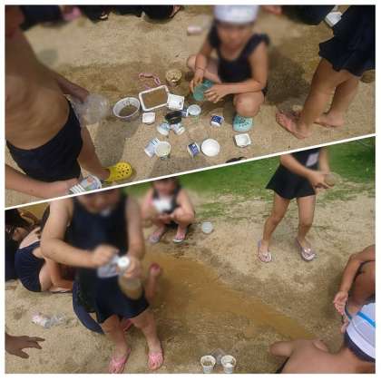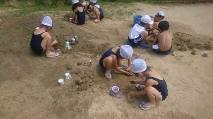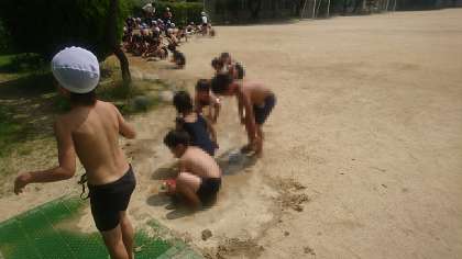 1年生が砂場でどろんこ遊びをしました。