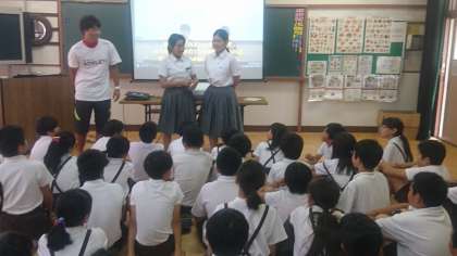 大正北中学校の生徒会の代表と先生に来ていただいて、6年生はクラブ紹介を受けました。