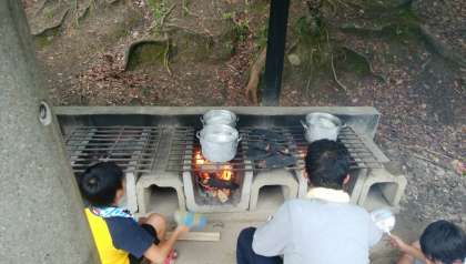 野外炊事をしています。