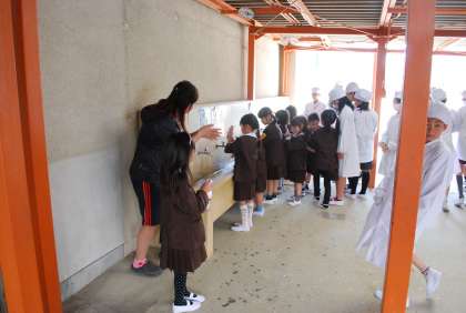まず、6年生のお兄ちゃん、お姉ちゃんたちに見守られて手を洗いました。大きい食缶は6年生に運んでもらいましたが、配膳は自分たちで協力して行いました。