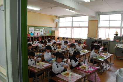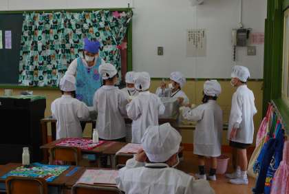 1年生は初めての給食なので、6年生にお手伝いをしてもらいました。